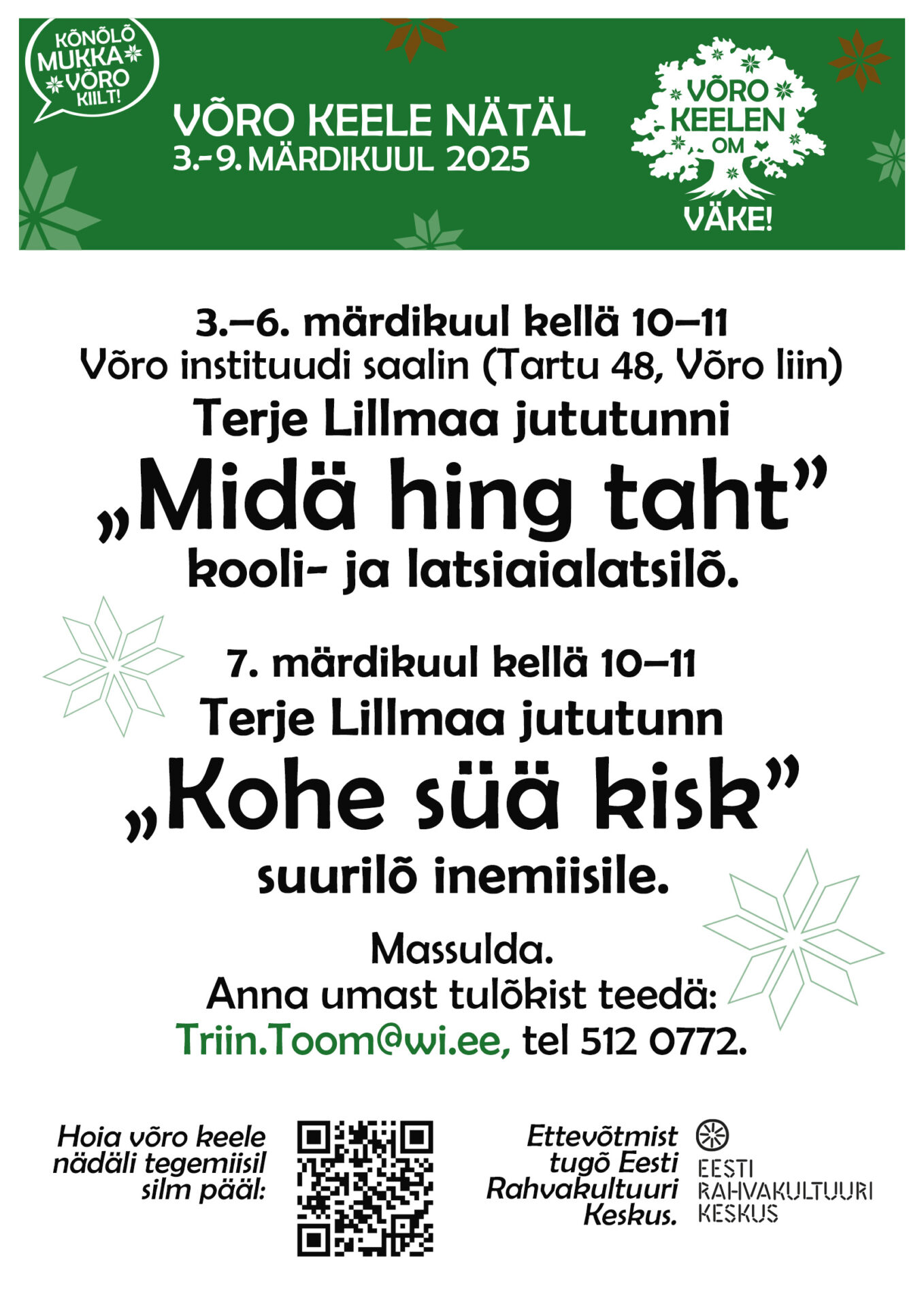 03.-06.11 kell 10.00-11.00 Terje Lillmaa jututunni “Midä hing taht” (latsiaia- ja koolilatsilõ)