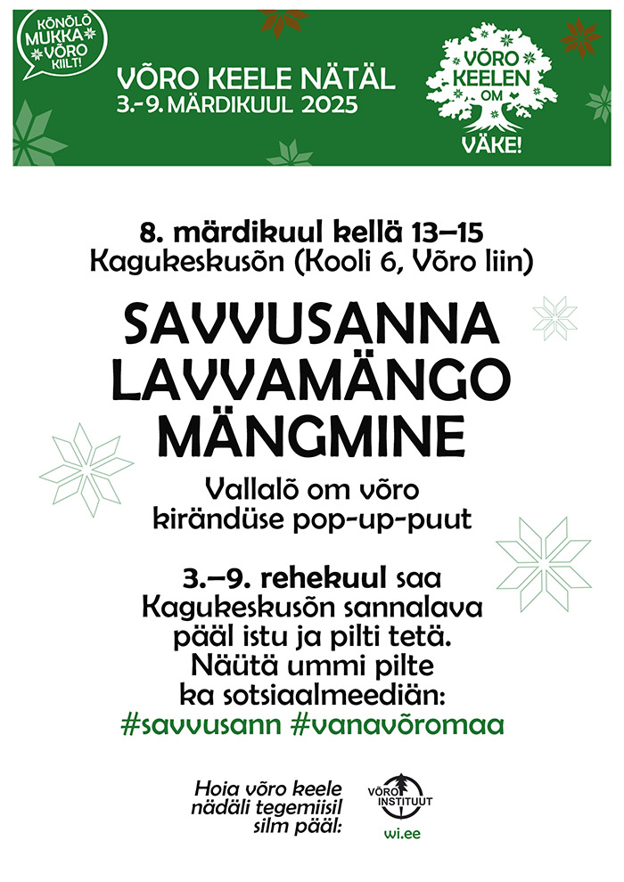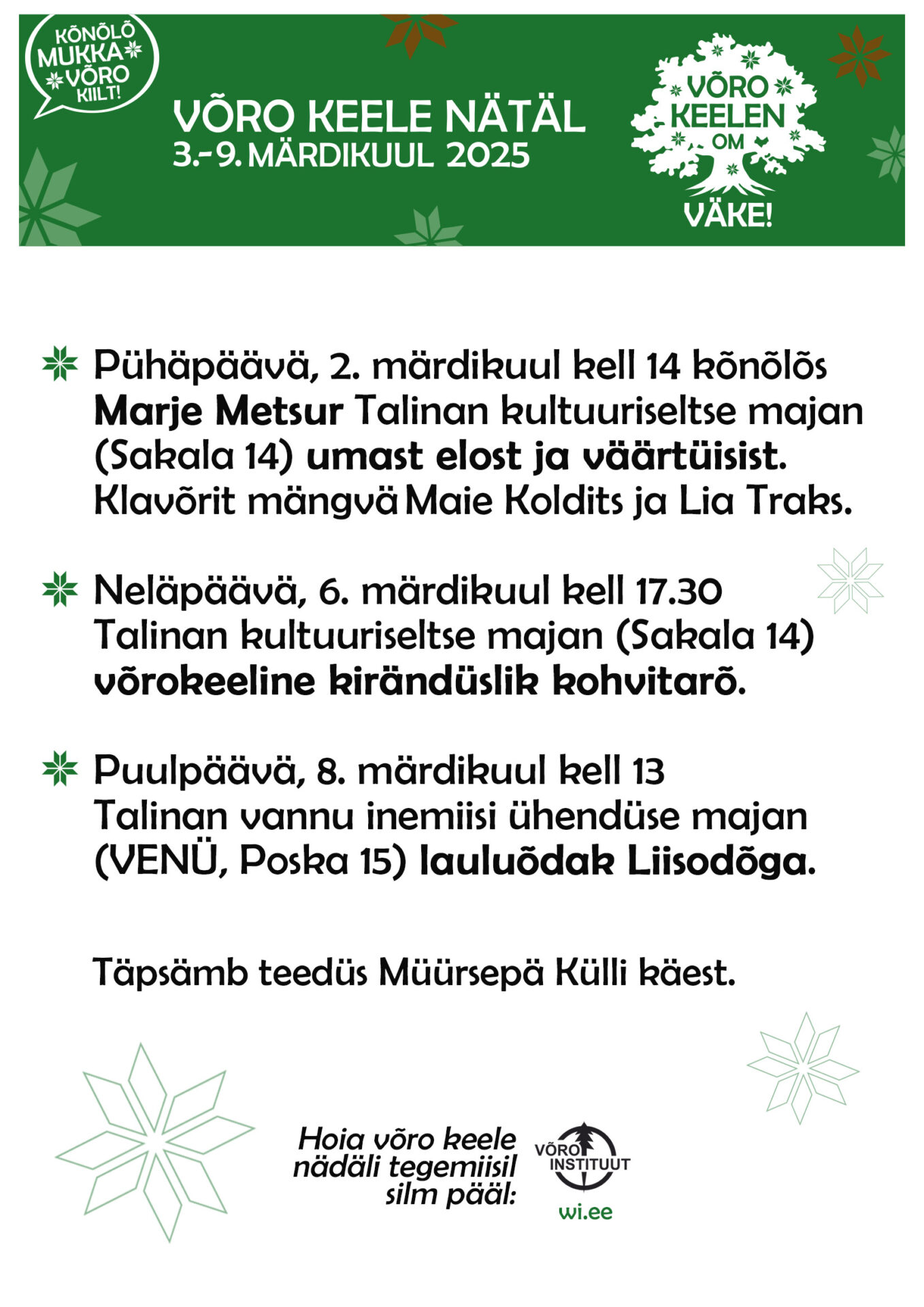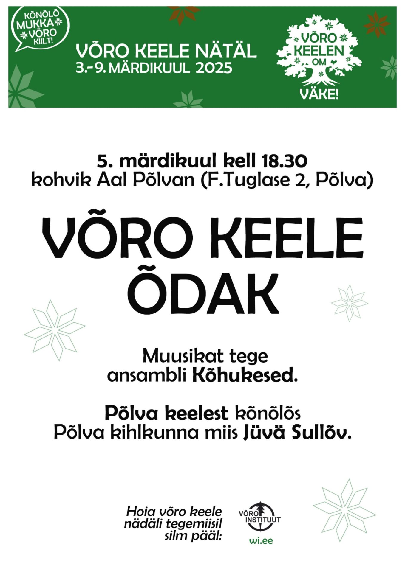 Võro keele nädäli päisit ja teedüspõhju saa tarvita umahindä võrokeelidse üritüse reklaamis.