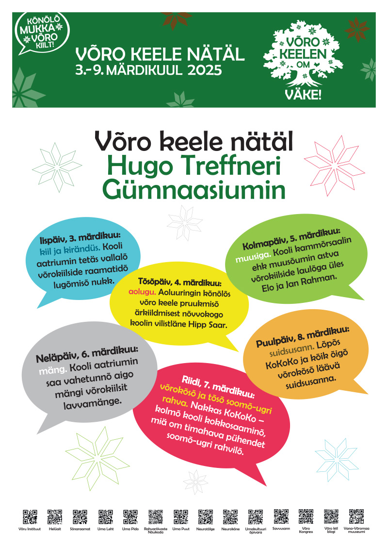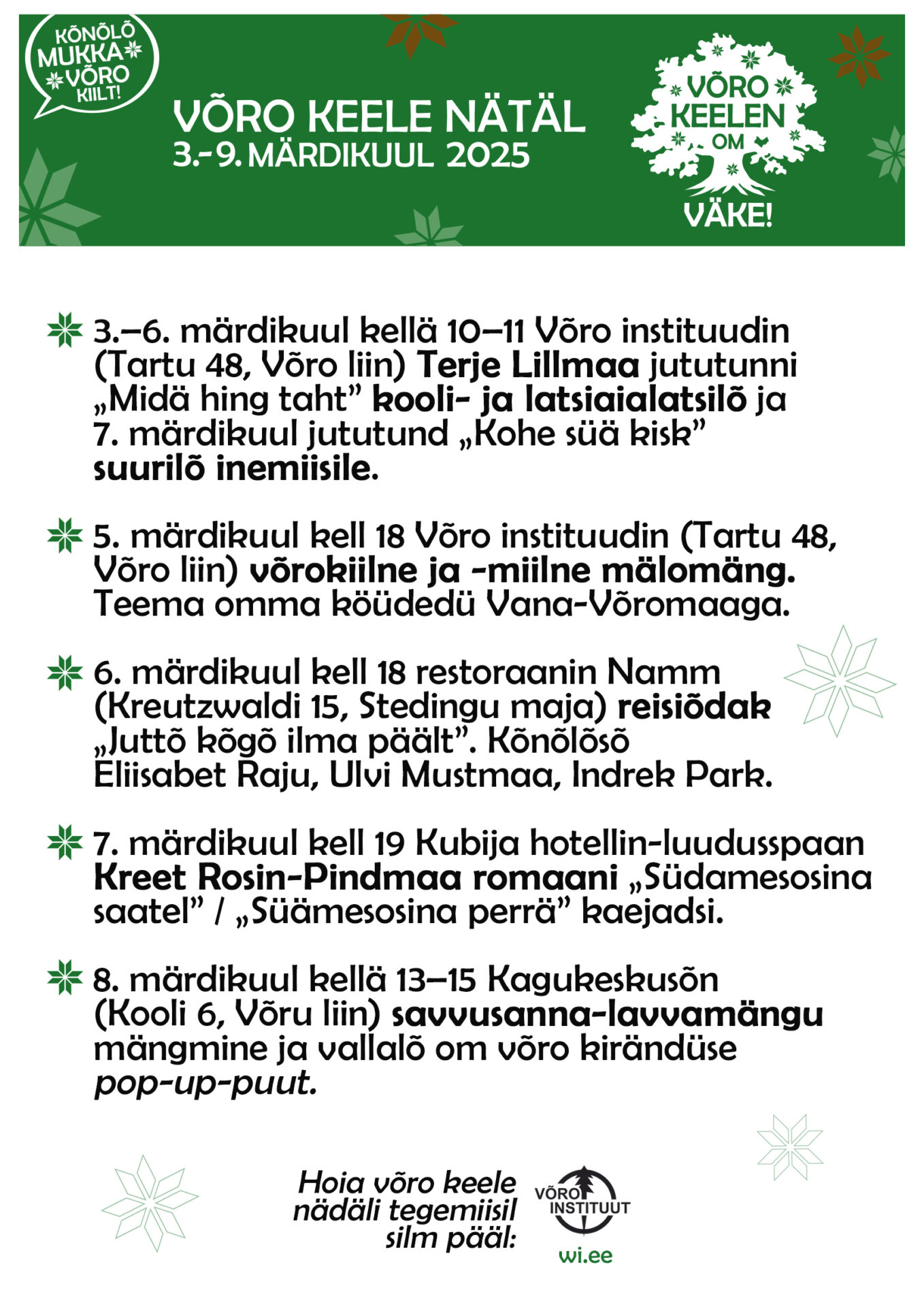 Võro keele nädälil pruugitas inämb võro kiilt latsiaian ja koolin, kohvitarõn ja raamadukogon. Kõik omma oodõdu kõnõlõma ja ka tuu jaos vahtsit kotussit ja võimaluisi luuma!